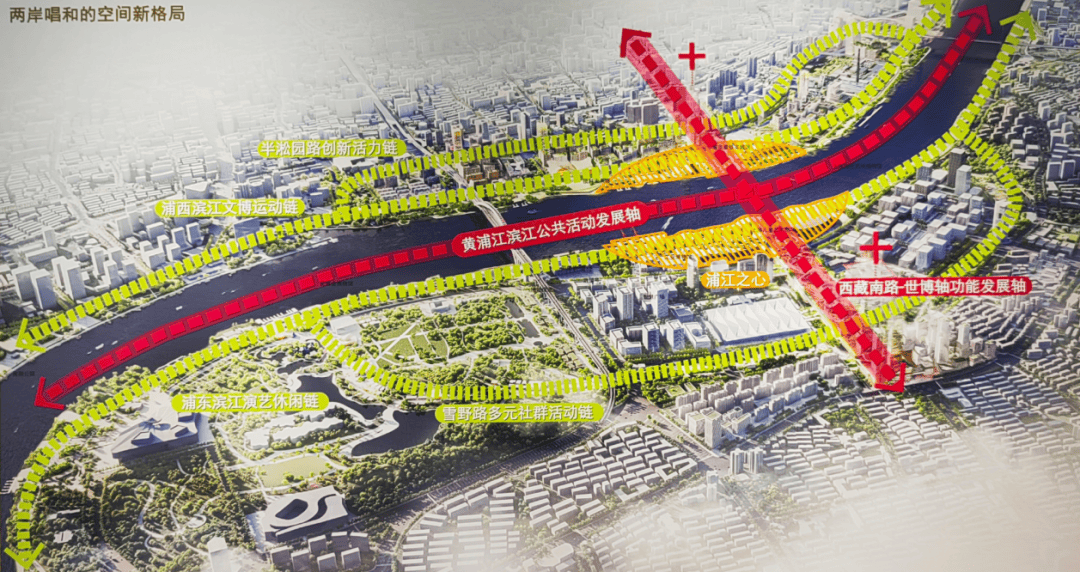 浦江之心利用了世博滨江与黄浦滨江区域众多的文化演艺设施,以及大尺度的滨江绿地公园,在浦江两岸核心区域,打造了一座互为对称的舞台与观演空间的盛会场所。