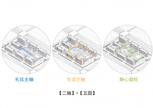 面对千张床位规模的复杂功能需求,山东三院创新性地引入了“两轴五园”的宏观规划结构,展现了其强大的逻辑梳理与空间组织能力。这套规划体系如同一座微型城市的精密骨架,确保了整个社区的高效、有序运转。其中,“生活主轴”的设计尤为精妙,它串联起一系列街巷式的邻里交往空间,营造出亲切、宜人的社区氛围;而位于二层的全天候风雨连廊,则构成了另一条独立的“服务轴线”,通过引入AGV物流机器人,实现了后勤物资运输的自动化与高效化,完美达成了人车分流与洁污分流,最大程度地减少了对长者日常生活的干扰,保障了居住环境的静谧与安全。与此同时,“礼仪主轴”则通过营造序列感强、气势恢宏的入口空间,赋予了归家之路应有的尊贵与仪式感。这套轴线系统,是设计逻辑与人文关怀的完美结合。
